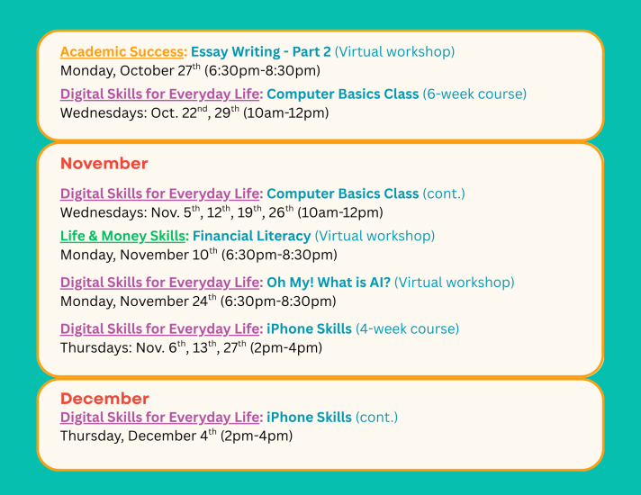 Workshops are FREE! Registration is required. Email us to register at: eyleliteracy@gmail.com