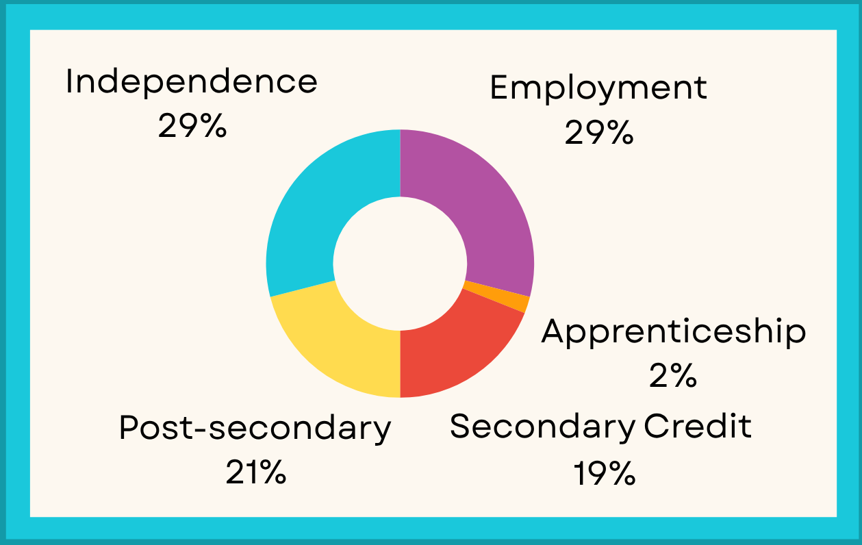 - Independence – develop greater everyday independence (e.g. complete driver’s license tests, count change while shopping, read signs and maps, perform basic computer operations). In 2024, 29% of learners pursued this pathway.